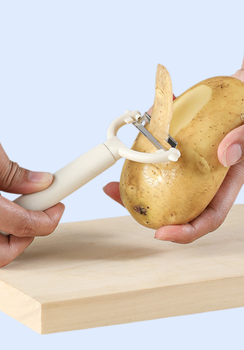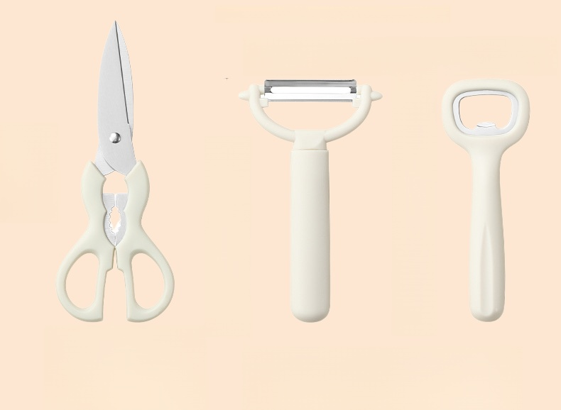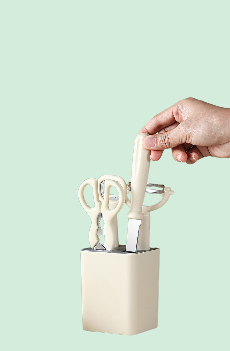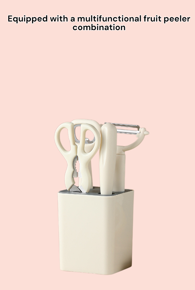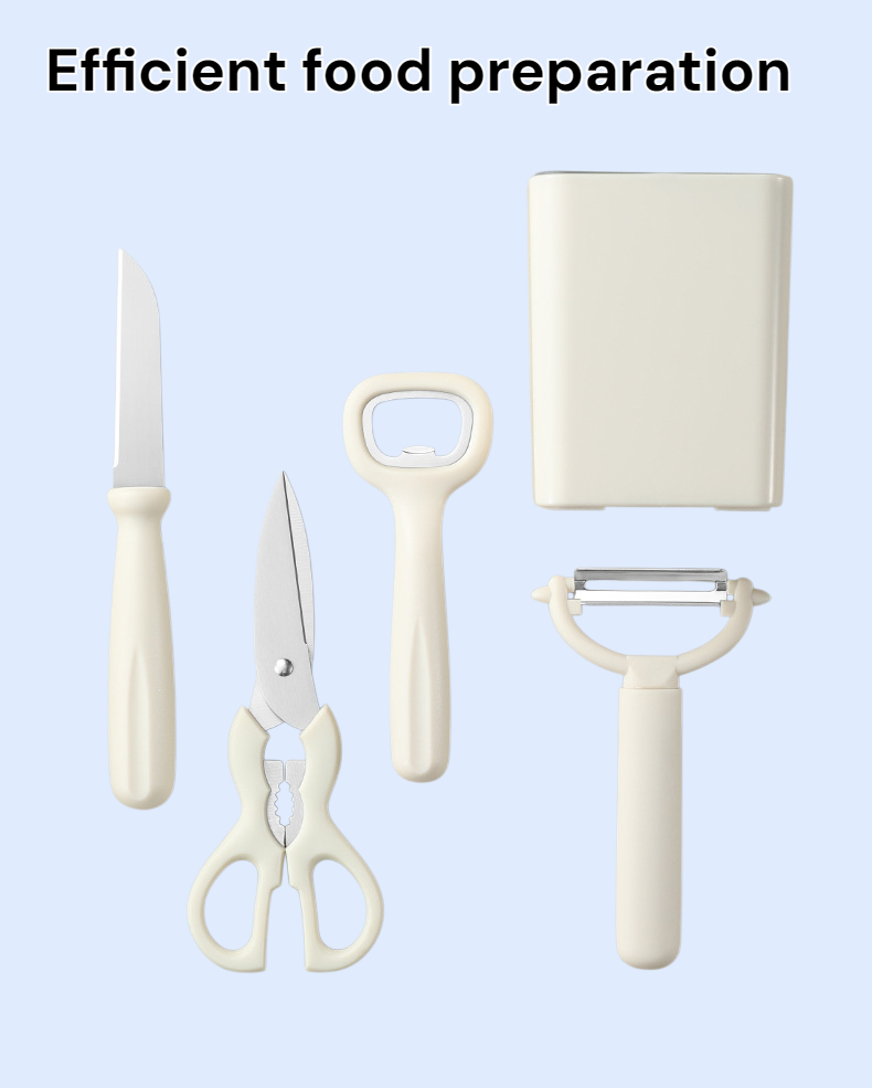 Includes 5 essential kitchen tools and a storage stand. Features a versatile fruit peeler combination for efficient food prep. Space-saving, durable, and easy to clean. Suitable for daily kitchen use.