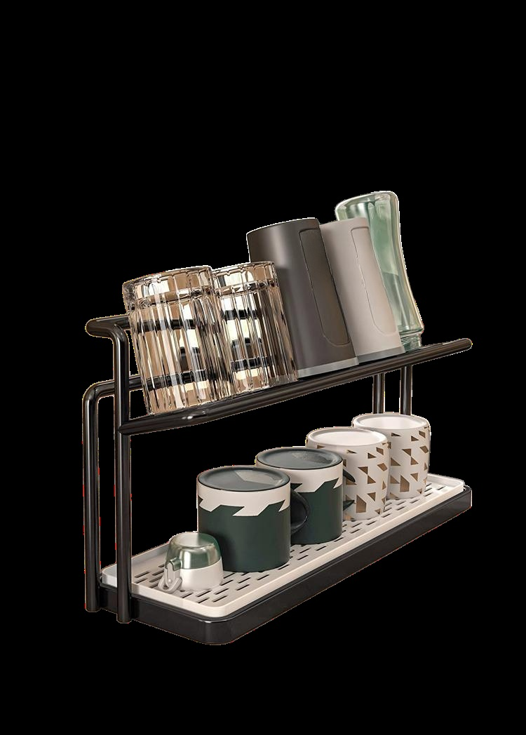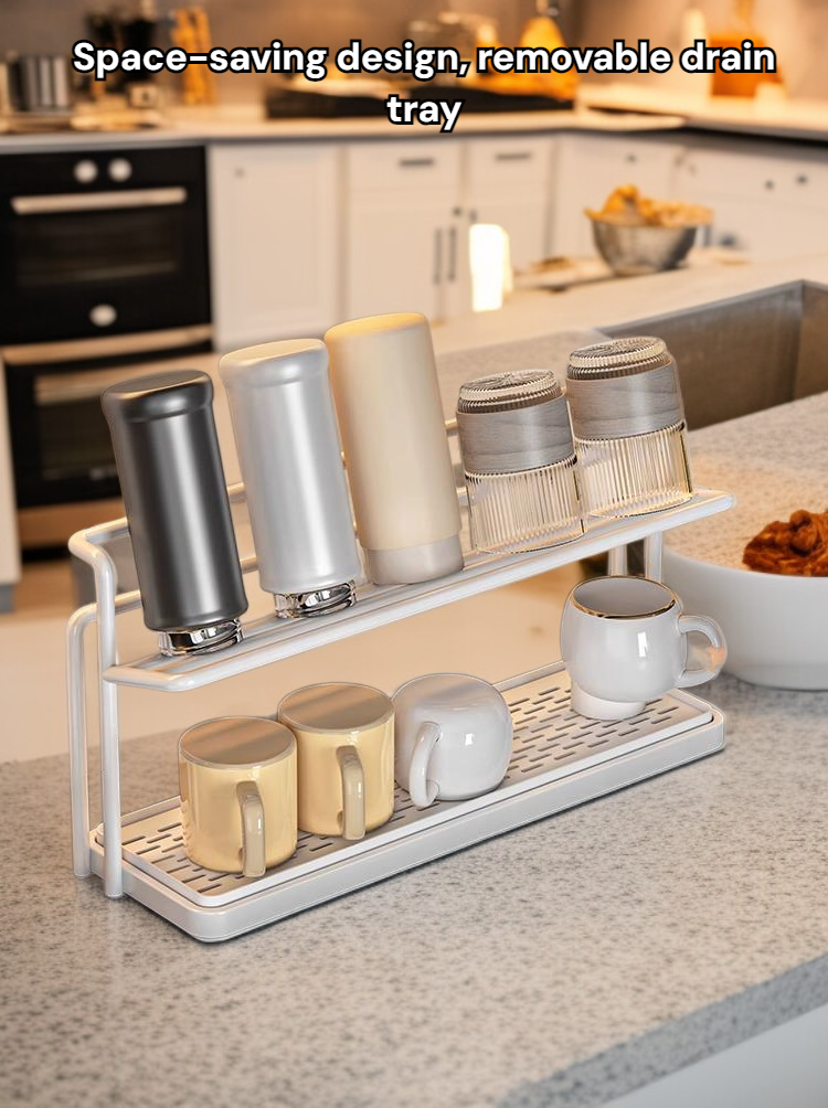 Double-layer cup rack for kitchen countertop, organized water cup storage, space-saving design, detachable drain tray, durable material, easy to clean, suitable for home and office use.